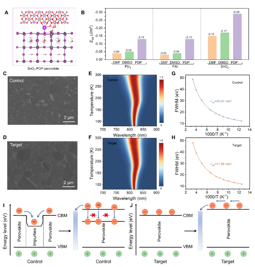 研究成员通过密度泛函理论计算发现虽然配位溶剂二甲基亚砜(DMSO)的添加可调控钙钛矿薄膜的生长,以得到高质量的薄膜;然而配位溶剂与底界面二氧化锡(SnO2)电子传输层具有更高的相互吸附能,成为加重溶剂残留的重要因素。溶剂残留一方面会导致残余碘化铅的形成,另一方面会诱导钙钛矿非晶相和孔隙等的形成;并且由于配位溶剂的吸湿性会阻碍钙钛矿从中间相向三维相的转变并诱导杂质相的产生。研究人员提出在二氧化锡和钙钛矿之间引入一层带孤对电子的无机磷酸二氢钾(PDP)竞争夹层。理论计算表明PDP与钙钛矿之间的吸附能高于对应的钙钛矿与配位溶剂之间的吸附能。这样PDP层的插入可减少底界面钙钛矿薄膜中的钙钛矿-DMSO相,并且PDP上的孤对电子有效地破坏了DMSO与SnO2的结合,同时PDP与SnO2强的吸附使其不会在钙钛矿前驱体成膜过程中进入钙钛矿层,最终实现了均质的钙钛矿底界面。另外PDP层的插入降低了钙钛矿薄膜中的光子声子耦合系数(Гop)、延长了载流子扩散长度。最终,基于结合能竞争调控策略,不同季节制备正置结构钙钛矿电池的一致性和重现性得到提升。
