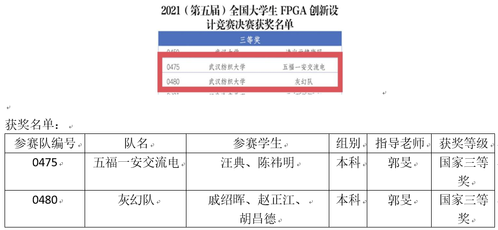 2021年11月29日,备受瞩目的2021(第五届)全国大学生FPGA创新设计竞赛决赛成绩揭晓。我yl23411集团学子在本次全国大学生FPGA创新设计竞赛中再创佳绩,共斩获全国三等奖2项。全国大学生FPGA创新设计竞赛是由中国电子学会、国家级实验教学示范中心联席会电子学科组主办,为了加强全国高校学生在数字系统设计领域尤其是可编程逻辑器件应用领域创新设计与工程实践能力,培养大学生积极主动寻找工作任务并利用先进技术平台进行创新设计的能力,丰富和活跃校园创新创业学术氛围,推进高校与企业的人才培养合作共建,为社会培养具有创新思维、团队合作精神、解决复杂工程问题能力的优秀人才。