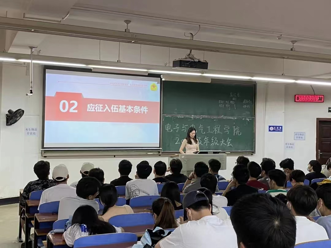 2020级辅导员涂亚腾老师和牟迪老师召开年级大会集中进行宣讲,从大学生入伍应征条件、应征流程、优待政策、发展途径以及经济补助等方面做了详细说明,并介绍了电信12001班余祥太、罗雪碧两位同学参军入伍的精彩经历,鼓励更多学生携笔从戎,报效祖国。