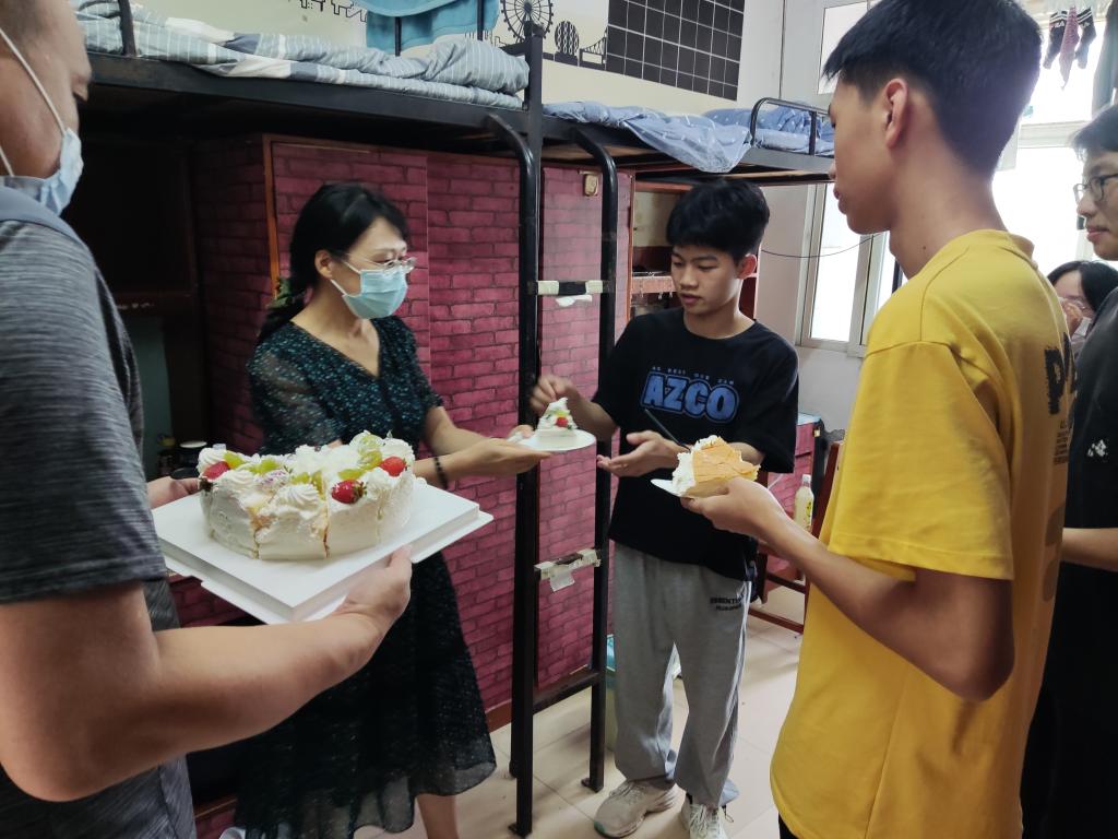 院党委书记张红鑫、副书记肖乃涛带领党员教师进寝室为3位9月10日过生日同学庆生,送去祝福和蛋糕,陪他们度过大学的第一个生日。她说尽管你们远离了父母,但是在这里也有家人陪你,我们都是一家人。