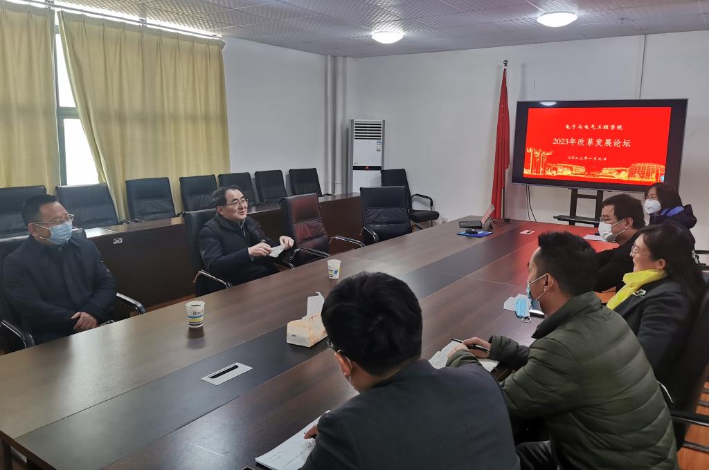田辉玉认真听取了电子电气学院2022年工作总结和2023年工作要点,充分肯定了学院2022年十件大事,并代表学校党委对全院师生2022年的辛勤付出、无私奉献表示衷心感谢。