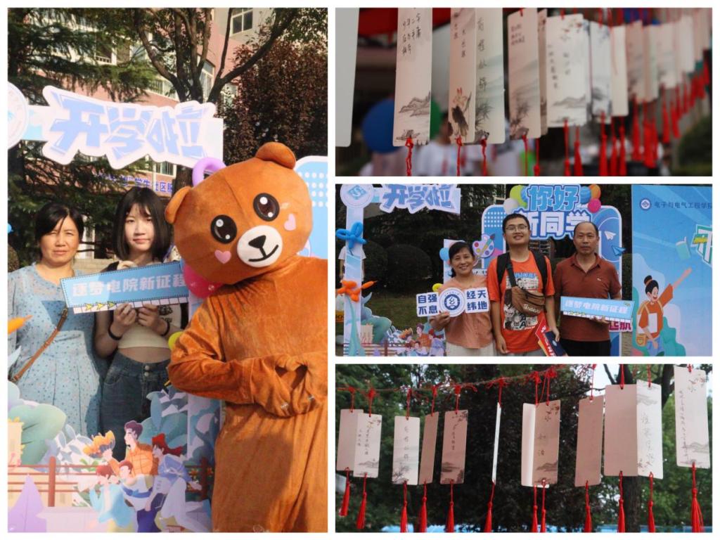 “恰逢九月时光正好”“电院正美我正年少”“逐梦电院新征程”“你好,新同学”……迎新志愿者高举创意标牌,与“吉祥物”一同热情引导新生“找到组织”,新生们拿着标语在签名墙前拍照留念,定格大学生活的珍贵瞬间。承载着梦想与希望的“许愿树”,映照着学院与萌新们之间的初遇,吸引了无数学子前来打卡。宿舍楼栋门口、走廊、迎新点摆满了气球,放眼望去,五颜六色,格外可爱。学生自发携各类乐器上阵,话筒、音响、演奏、配乐,烘托热烈氛围。从日出到日落,校园内的“红马甲”们,始终没有停下他们的步伐,用负责的工作态度和饱满的工作热情将志愿精神传播到校园里的每个角落。