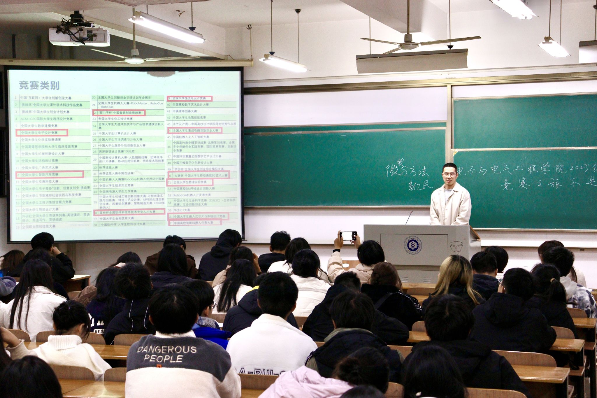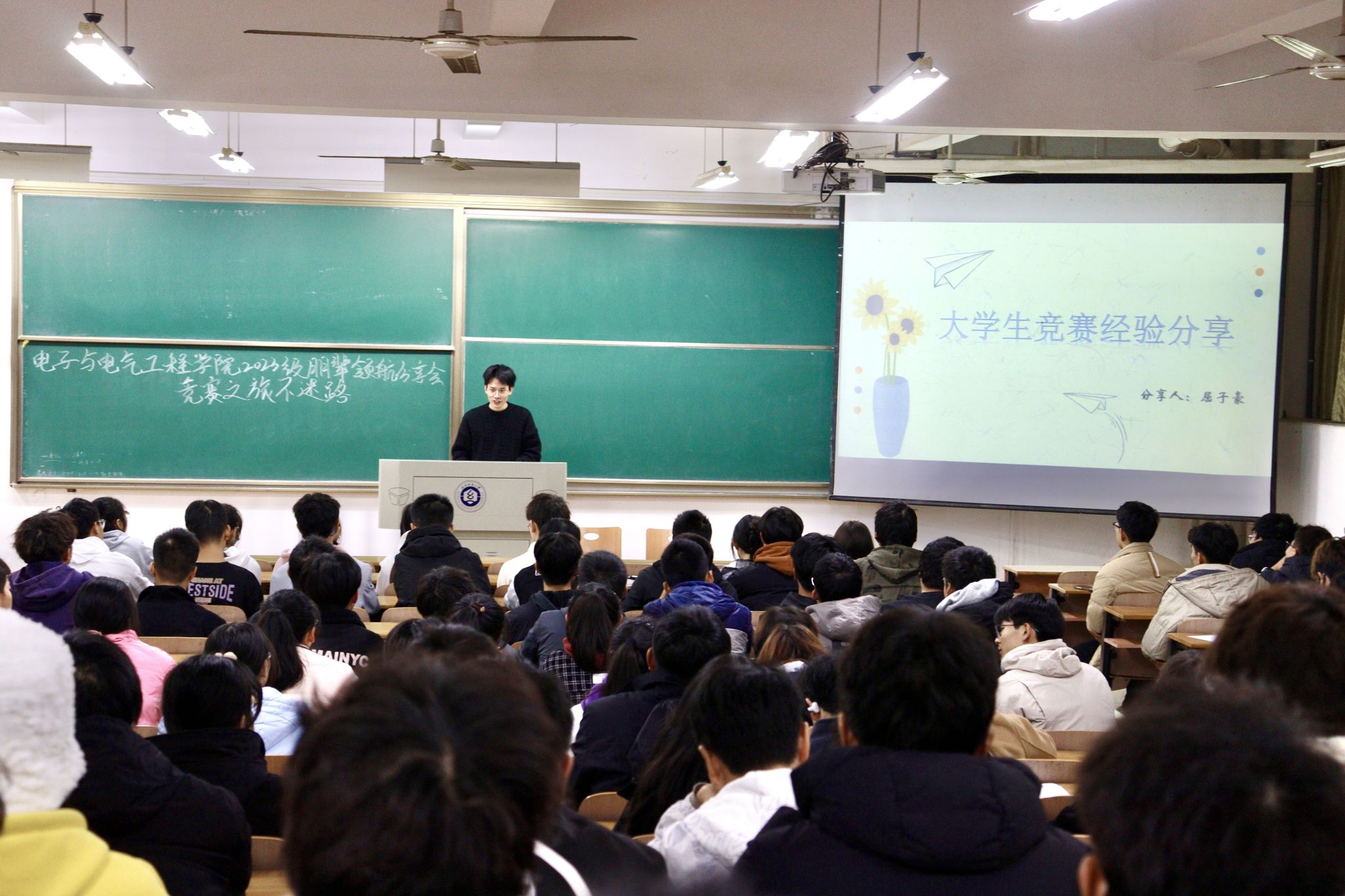为助力新生更全面、深入地了解学科竞赛相关情况,进一步培养学生创新思维和创新意识,不断加强学风建设,发挥优秀青年学生朋辈影响力和号召力,11月26日晚上,yl23411集团在阳光校区六号教学楼111教室和113教室开展了“竞赛之旅不迷路”朋辈领航分享会活动。本次分享会由电气12104朱云航、电气12104班屈子豪、电信12103严业畅、通信12101班梅寒4名同学担任主讲人,2023级辅导员陈珍老师及全体2023级学生参加本次活动。
