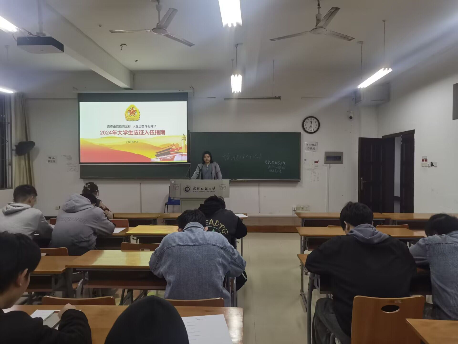 各年级辅导员分别从应征入伍基本条件、入伍流程、大学生参军特别优惠政策等方面向学生们进行了讲解,并强调了报名注意事项。2020级辅导员涂亚腾就毕业生当兵退役复学后考研、经济补贴方面进行了详细介绍;2021级辅导员石亚楠、冉晨,围绕我国征兵政策和参军流程展开,为大三学生们讲述了投身火热军营,献身国防事业的重要性,同时提醒计划参军入伍的同学们注意电信诈骗;2022级辅导员张朋龙讲解了大学生入伍的各种优势,鼓励青年学生投身于建设祖国国防的火热实践中;2023级辅导员陈珍通过晚点名的形式,向新生们宣讲了入伍基本政策,同时介绍了军营生活,激起了广大学生的热情,在宣讲会结束后,还通过线上与线下的方式向辅导员询问更多大学生入伍的相关情况。