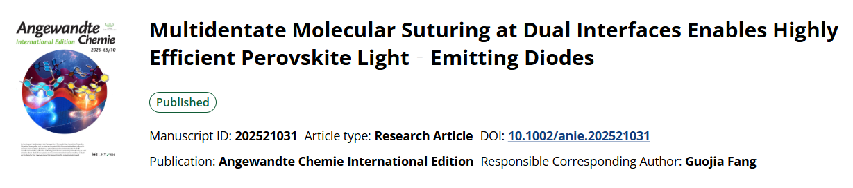 近日,我校电气学院先进能源与未来显示技术团队曹晓娟博士、姚方副教授等人在国际著名期刊《Angewandte Chemie International Edition》上在线发表了题为“Multidentate Molecular Suturing at Dual Interfaces Enables Highly Efficient Perovskite Light-Emitting Diodes”(多齿分子双界面缝合策略实现高效钙钛矿发光二极管)的研究成果(https://doi.org/10.1002/anie.202521031)。yL23411永利集团为第一单位,武汉大学及华中农业大学为合作单位,曹晓娟博士及联合培养研究生王璇为论文的共同第一作者,方国家教授、雷红伟副教授、姚方副教授为论文的共同通讯作者。