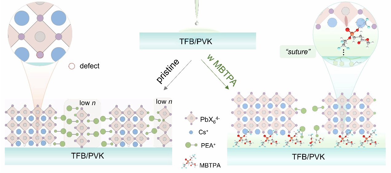 针对上述问题,团队研究人员提出了一种新的“分子缝合”策略,即通过引入多功能配体来同步稳定界面并引导晶体生长的。采用甲基双(2,2,2-三氟乙基)膦酰乙酸酯(MBTPA)多齿配体分子,其中羰基(C=O)和磷氧基(P=O)基团能与钙钛矿中未配位的Pb2+离子形成配位相互作用,有效钝化缺陷态,抑制非辐射复合。与此同时,三氟甲基(-CF3)基团则与空穴注入层建立起稳固的氢键相互作用。这种双官能团设计使得MBTPA分子犹如微观“缝合线”,从两侧分别与钙钛矿和空穴传输层形成化学相互作用,从而将埋藏界面紧密地“缝合”起来。这种双界面相互作用机制优化了能级排列,并引导钙钛矿薄膜形成高质量、低缺陷的晶格结构。最终,经MBTPA修饰的PeLEDs器件实现了波长485 nm和513 nm处的明亮蓝/绿光发射,其峰值外量子效率(EQE)分别达到23.14%和27.05%。这种“分子缝合”策略为同时调控界面化学性质和结晶过程提供了一条有效途径,展现了其在未来显示和照明领域广阔的应用前景。