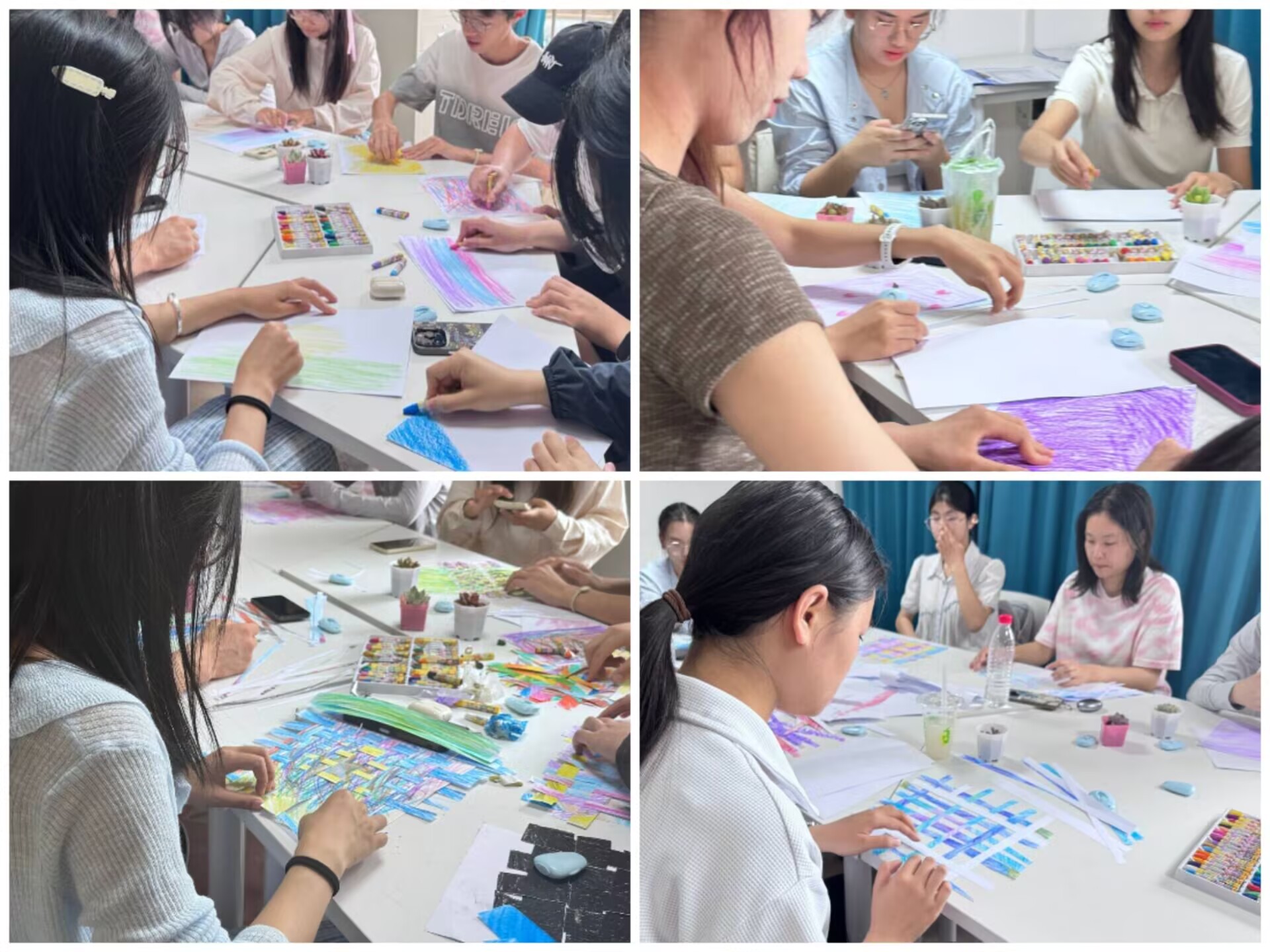 活动分三个环节。首先,大家用蜡笔在A4纸上随心涂鸦,以色彩表达内心情绪,如有的用红色展现激情,有的用蓝色体现平静。随后,将涂好的作品裁成条并拼接,象征着破碎情绪的重新组合。最后,作品分组评选,同学们相互交流欣赏,现场气氛热烈和谐。