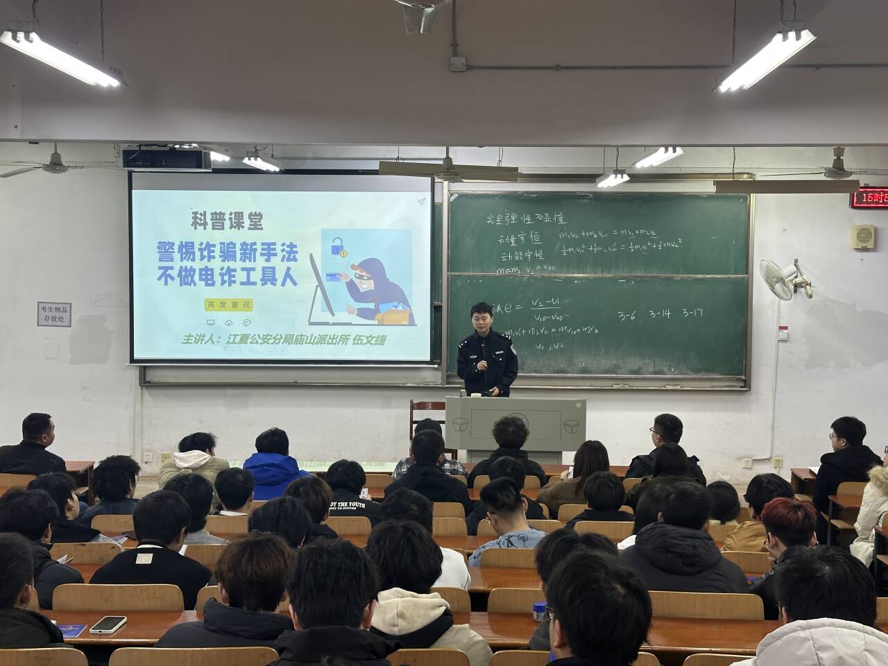 为提升学生反诈防诈意识与自我保护能力,遏制电信网络诈骗案件发生,3月17日,电子电气学院邀请江夏公安分局庙山派出所开展反诈专题宣讲。庙山派出所所长邱波、学校保卫处副处长马绪亮出席,学院全体辅导员、本科生、研究生学生干部、寝室长参会。