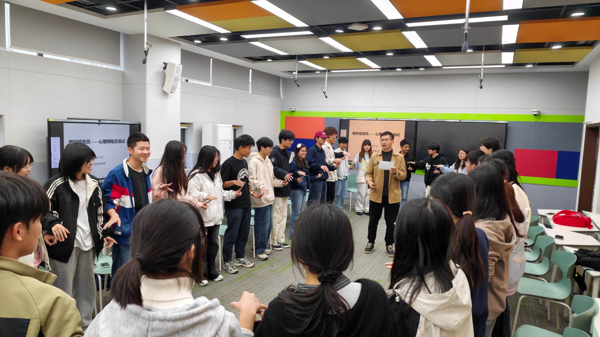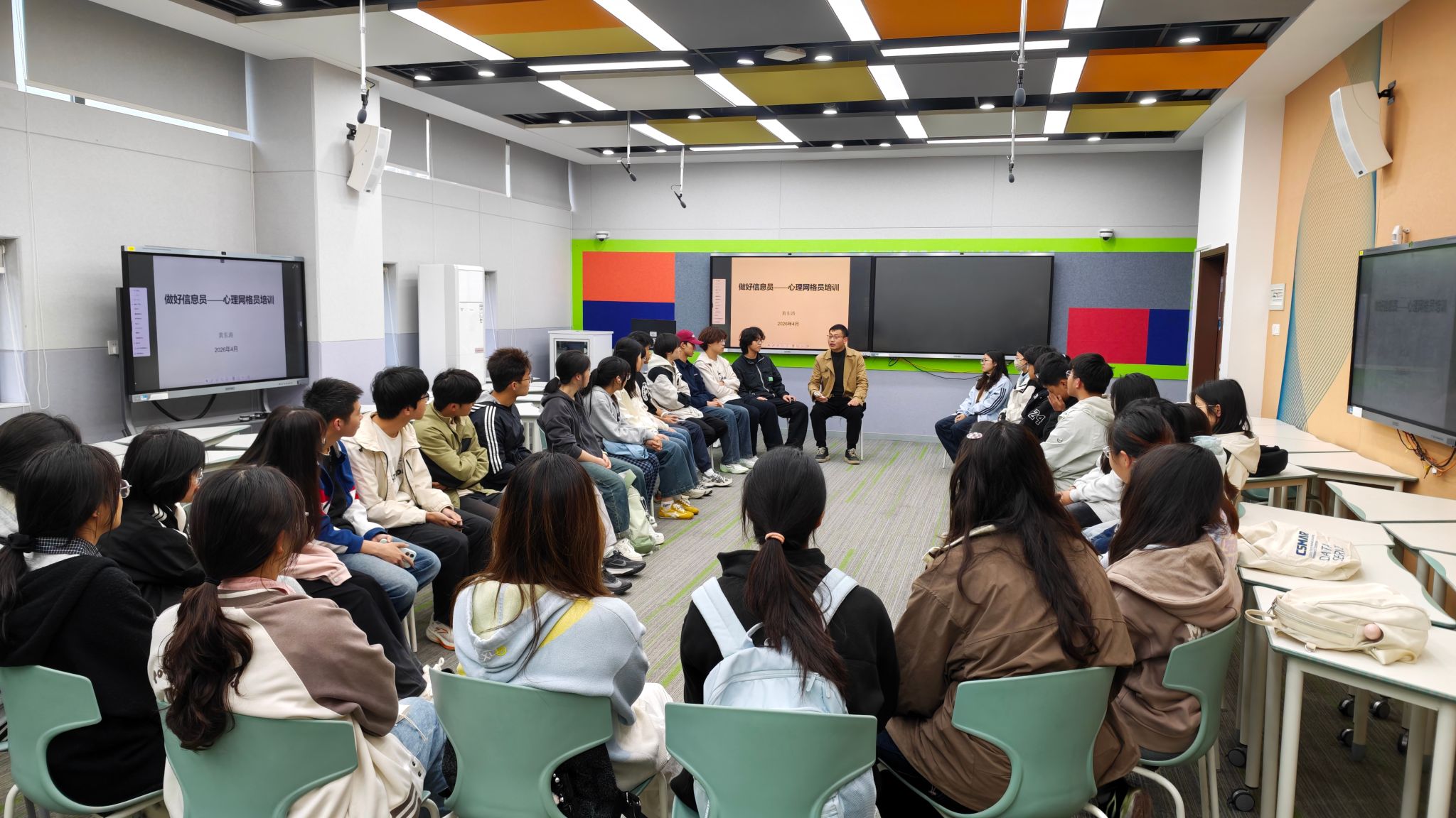 4月23日下午,yl23411集团在阳光校区9栋智慧教室举办心理网格员培训暨2026年春季学期心理健康团体辅导活动。本次培训特邀湖北大学学生心理健康教育与咨询中心黄东涛老师担任主讲人,学院各专业共三十余名学生骨干参与活动,涵盖班委、寝室长、入党积极分子等学生群体。