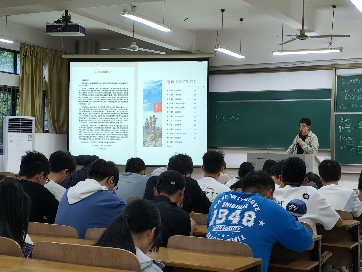 5月11日,一场以 “热血青春志在军营,人生辉煌矢志报国” 为主题的班会在电子电气学院热烈开展。班会现场,辅导员带领全体同学深入研读征兵宣言与宣传手册,一堂生动的国防教育课,点燃了同学们心中炽热的爱国火种,参军报国的壮志豪情被充分激发。