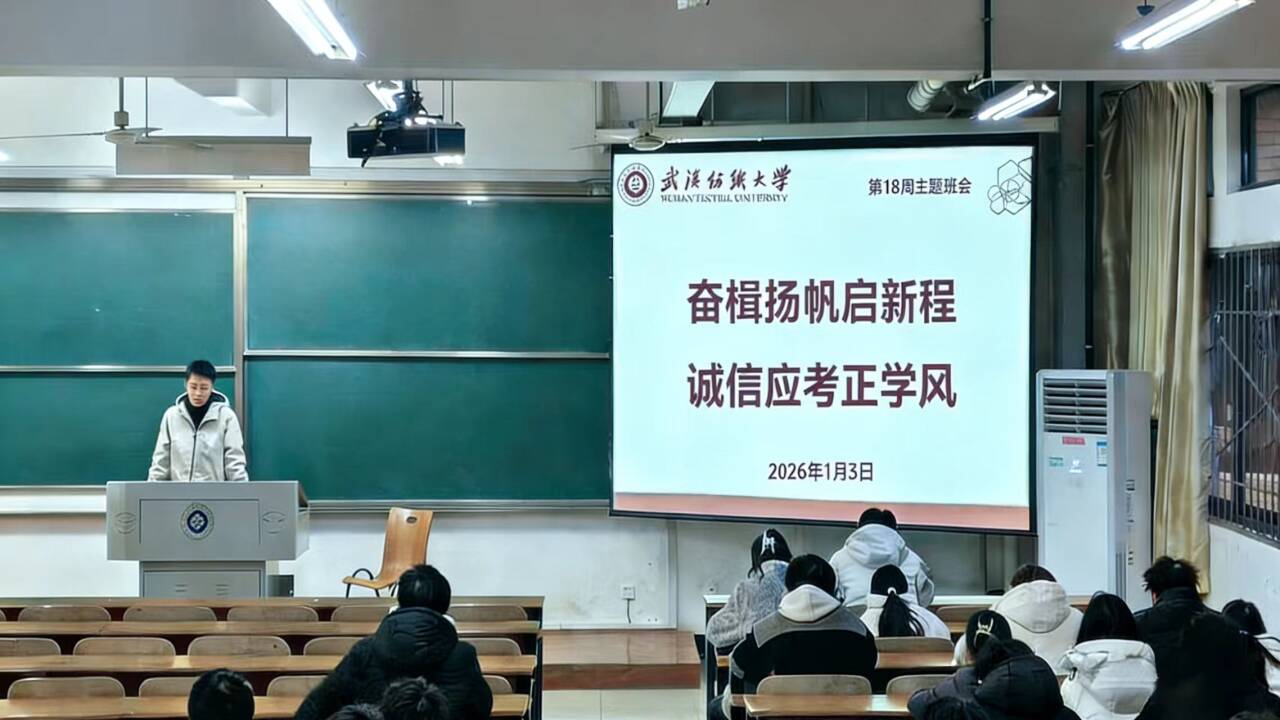 班会现场,辅导员首先带领同学们学习了习近平主席二〇二六年新年贺词及学校新年贺词核心精神,回顾国家“十四五”收官成就与学校“双一流”建设进展,激励大家将个人奋斗融入时代发展浪潮。随后,围绕期末备考与诚信应考展开重点讲解,明确考试纪律要求,强调严禁作弊、替考等违纪违法行为,解读相关处罚规定与法律后果;同时分享高效复习方法,建议同学们制定个性化复习计划、善用学习资源、调节身心状态,以扎实准备应对考试。