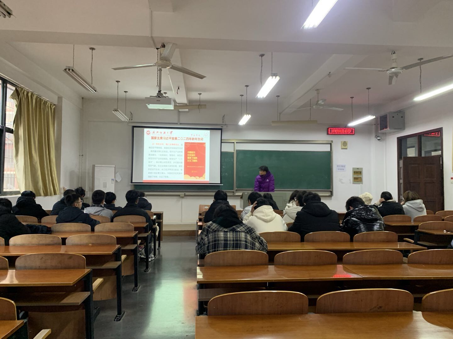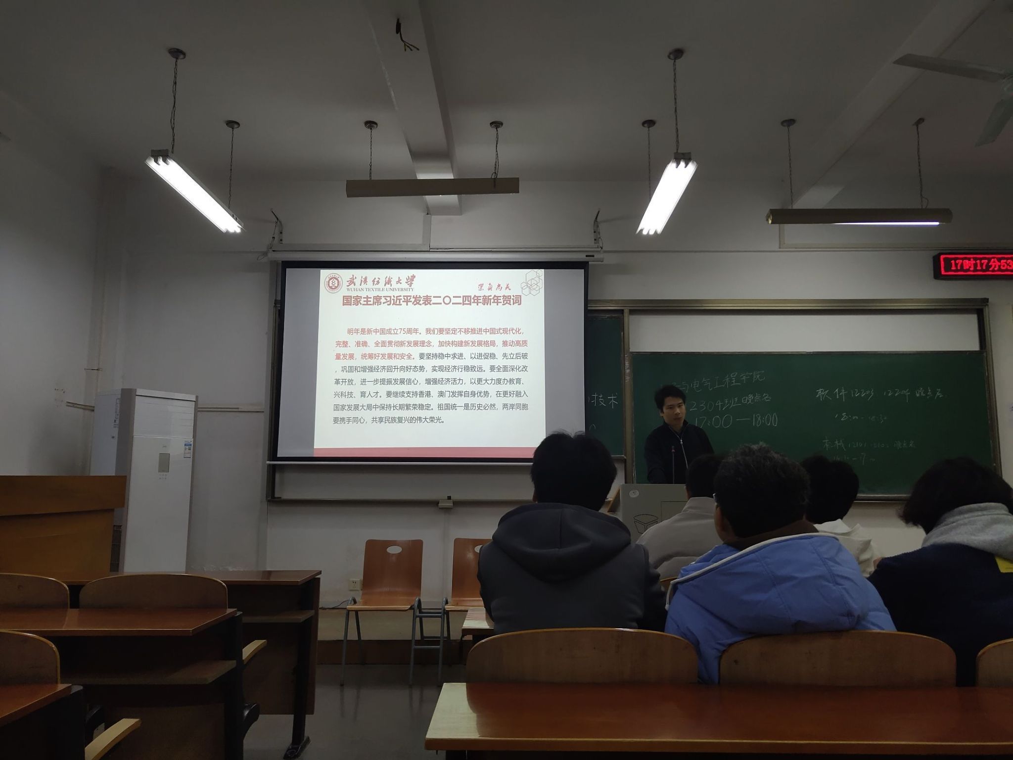在班会活动上,我们也了解了纺大的2024年新年贺词。2023年纺大人锐意进取,奋发向上,自强不息,取得了学科建设、学术创新、学生培养、学校发展等诸多方面的一个又一个发展和突破。同学们了解到纺大人“自强不息,经天纬地”的崇高精神,也更因为这次班会,我们更加为学校自豪,为纺大人自豪,同时坚定了自己努力学习、发展自身的信念,在2024年这个纺大发展的又一个新起点,为建设美好纺大添砖加瓦。